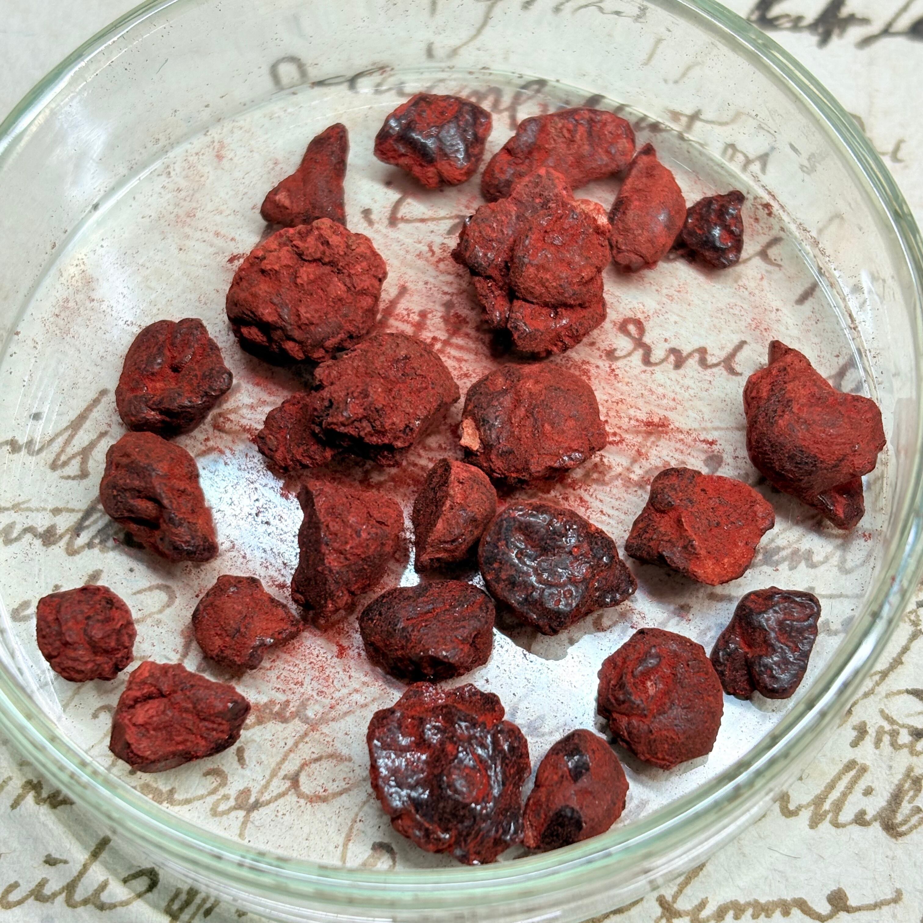 匂いはほとんどありませんが 血のように赤黒く、キラキラとした輝きがあり、砕くと血のような赤い粉末ができます